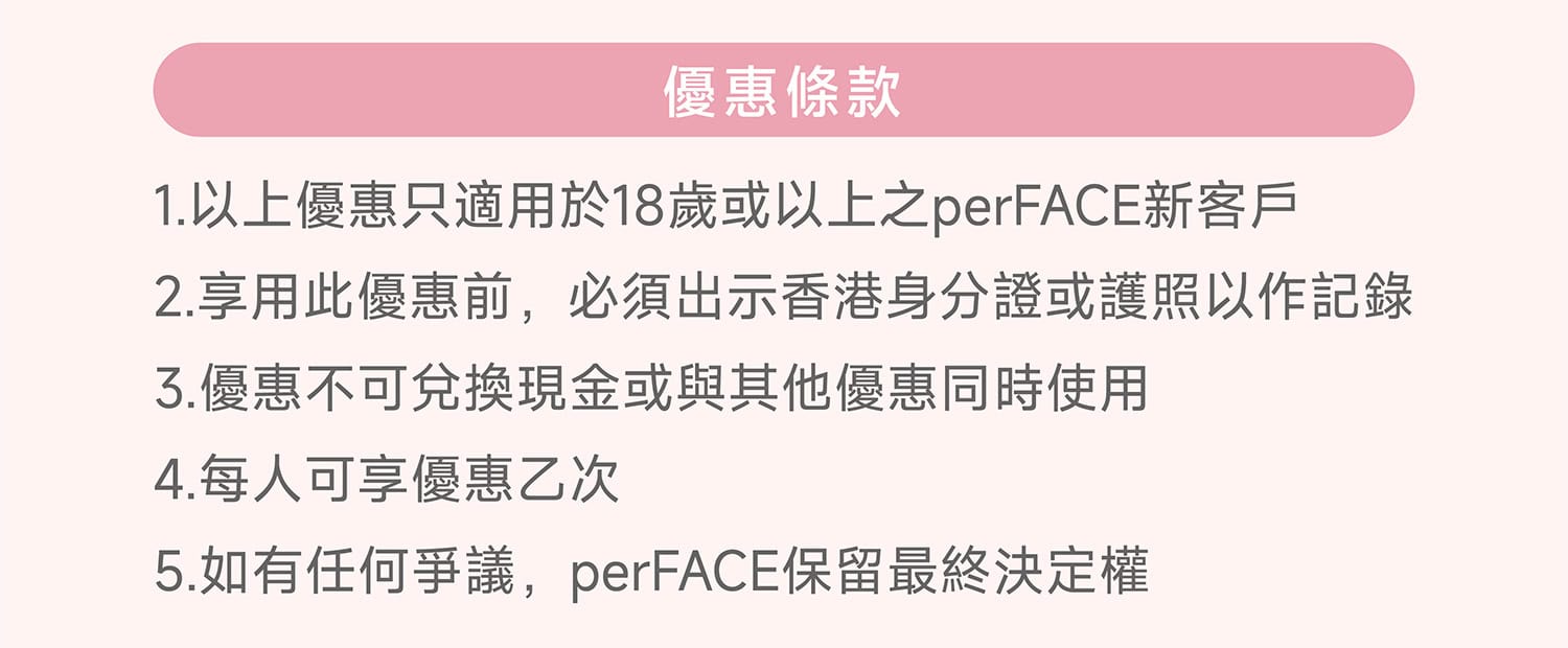 點擊「提交」即表示你同意perFACE的《優惠條款》、《私隱政策》、《條款及細則